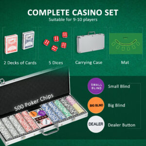 - Complete set with 500 chips, two decks of cards, five dices, a dealer button, a small and big blind and a mat