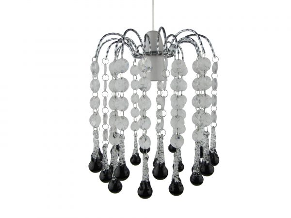 A delightful small glass water fountain shade with glass droplets and a black tear drop at the bottom of each strand. 20cm dia and easy fit.