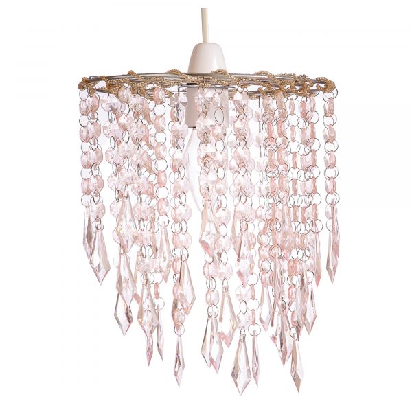 Mini Chandelier with soft pink beads dropping from an easy fit frame, Very pretty easy fit crystal look a like shade 20cm dia