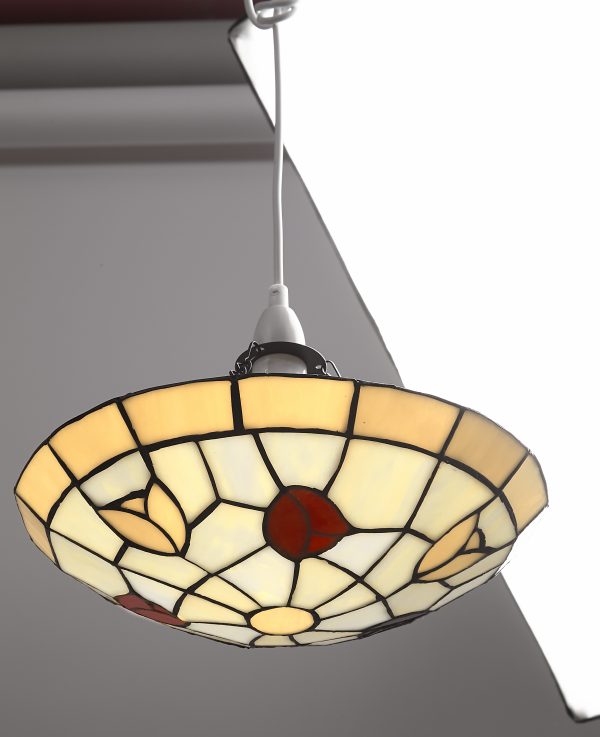 A 30cm Tiffany uplighter plate with Beige and red tulips, The glass is opalescent and looks stunning giving a soft colourful light, The plate has a chain which is easy fit to your bulb holder. Wattage can be up a 100 watt illumination.