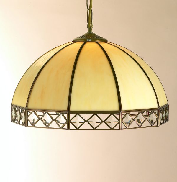 A very high quality range of Bevelled glass suite of lanterns, wall lights and table lamps. BV48P is a 40cm pendant in beige bent glass with brass inlay . With beautiful bevelled glass at the base instead of a fringe.