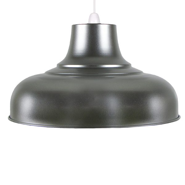 A very large steel shade, 40cm dia featuring a high gloss painted finish. They are high gloss interiors which with our 10cm dia globe bulbs with 100 w Illumination only using 15 watt – look stunning. The model shown is Silver/Aluminium colour.