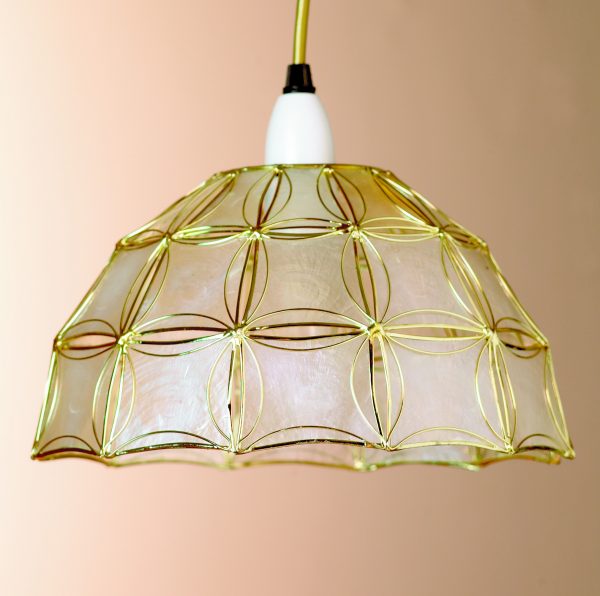 A delightful Capiz shell shade in the form of a dome with unusual shell shapes and decorated throughout with gold colored brass wire. A nice white d_cor bulb would make the shade stunning. You can also order these in LED from us.
