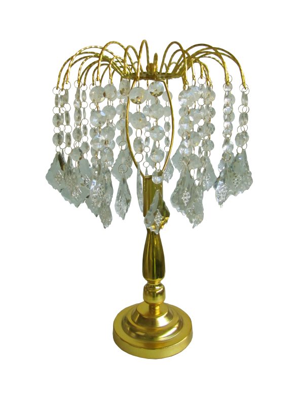 A stunning gold effect table tamp with a 3 tier water fountain on the gold effect base . Looks expensive but is fantatic value for money as a clear bulb reflects the light on the clear beads.