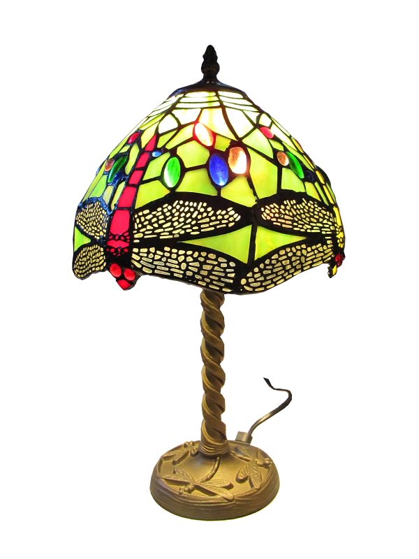 Exquisite and very popular little tiffany table lamp featuring a simple but beautiful multi-colured dragonfly design , the model is 20cm diameter shade with a unique antique small table lamp base. Very elegant and stands 35cm tall and takes a 40 watt E14 bulb or higher in LED.