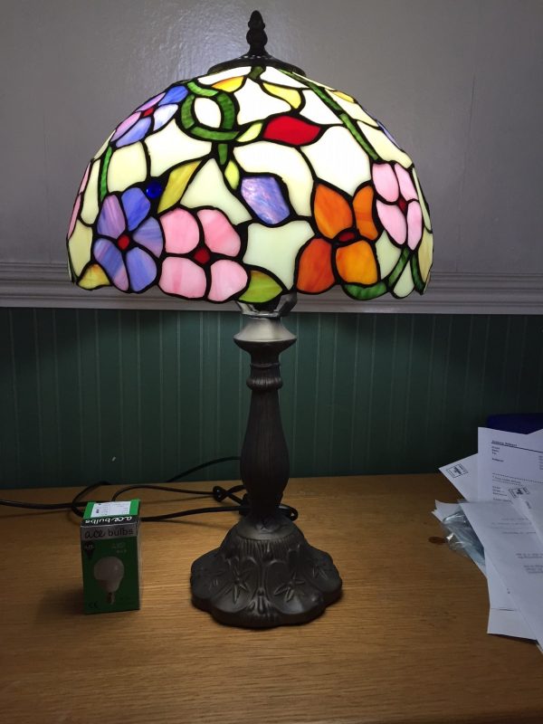 A patchwork tiffany shade with spring flowers in beautiful pastel colours and light green leaves and a cream background. The table lamp will brighten any room and is offerred in 30cm diameter shade with an E27 bulbholder and an atuiqe base ideal for up to 60 watt or LED,
