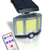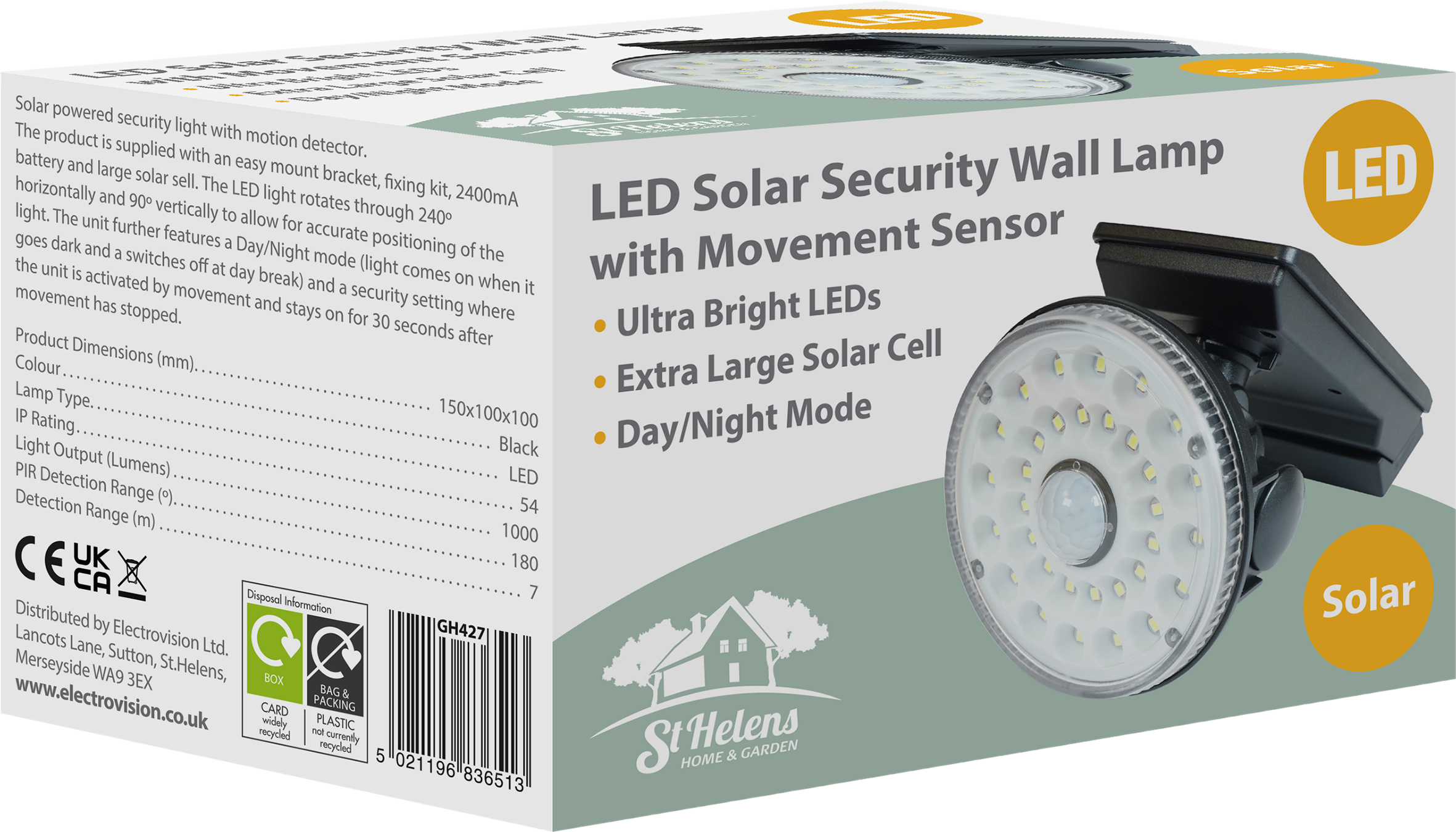 Solar powered security light with motion detector. The product is supplied with an easy mount bracket, fixing kit, 2400mA battery and large solar sell. The LED light rotates through 240 degs horizontally and 90 deg vertically to allow for accurate positioning of the light. The unit further features a Day/Night mode (light comes on when it goes dark and a switches off at day break) and a security setting where the unit is activated by movement and stays on for 30 seconds after movement has stopped.
