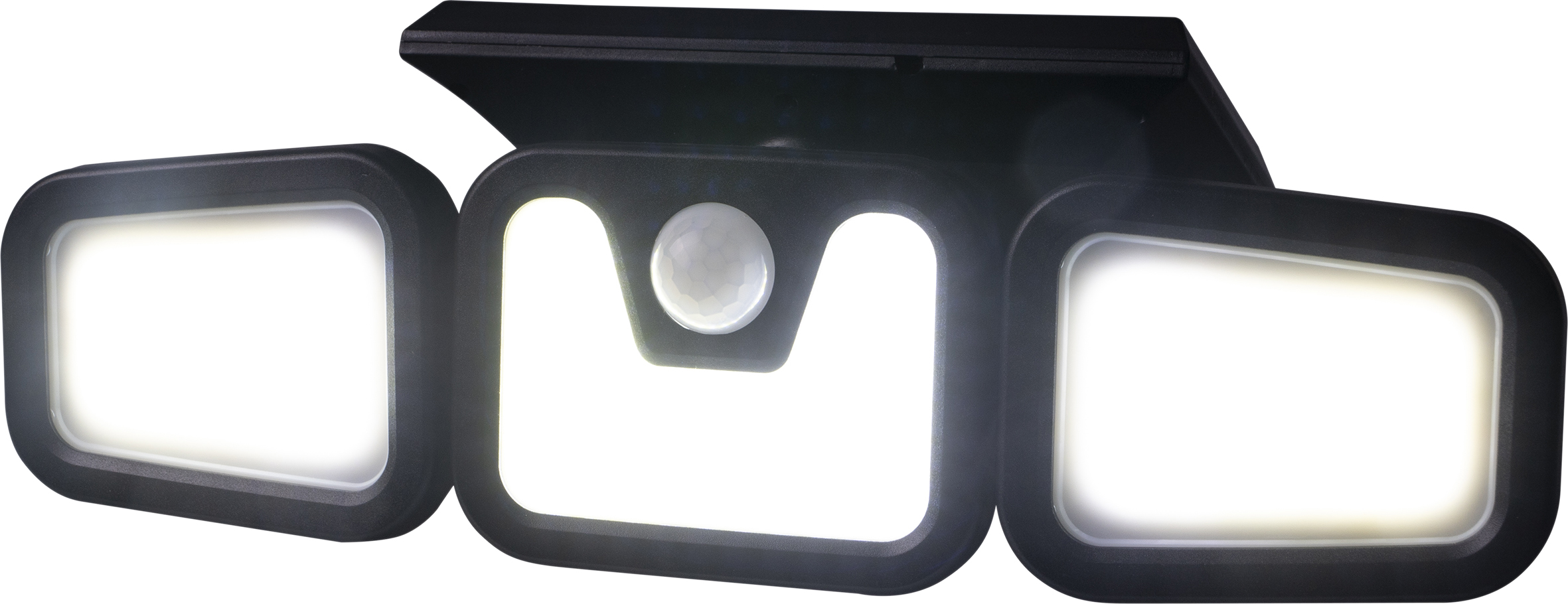 The St Helens Home and Garden solar powered motion sensor security light has 3 COB heads and gives a 260 lumen illumination. The outer heads can be angled to focus light wherever it is needed. The light detects motion up to 3m away at a 120 degree angle and will illuminate for 20 seconds. The light can be set to illuminate in low light or full light. The unit is powered by a built in 3,000mA battery. Manufactured from ABS plastic. The light is fitted with a 5.5v 1.5W polysilicon solar panel. The light has 3 pre drilled holes in the solar panel for easy wall mounting.