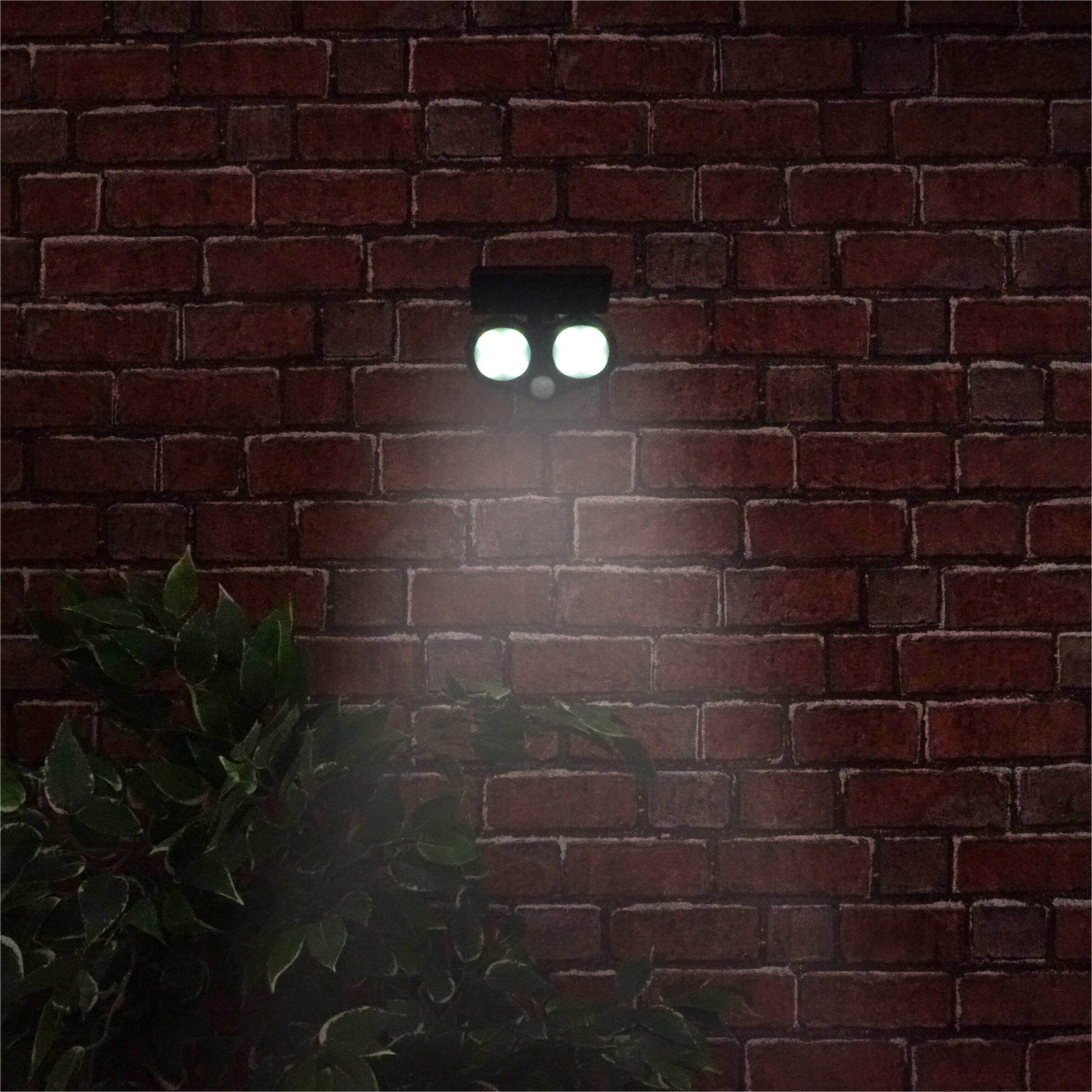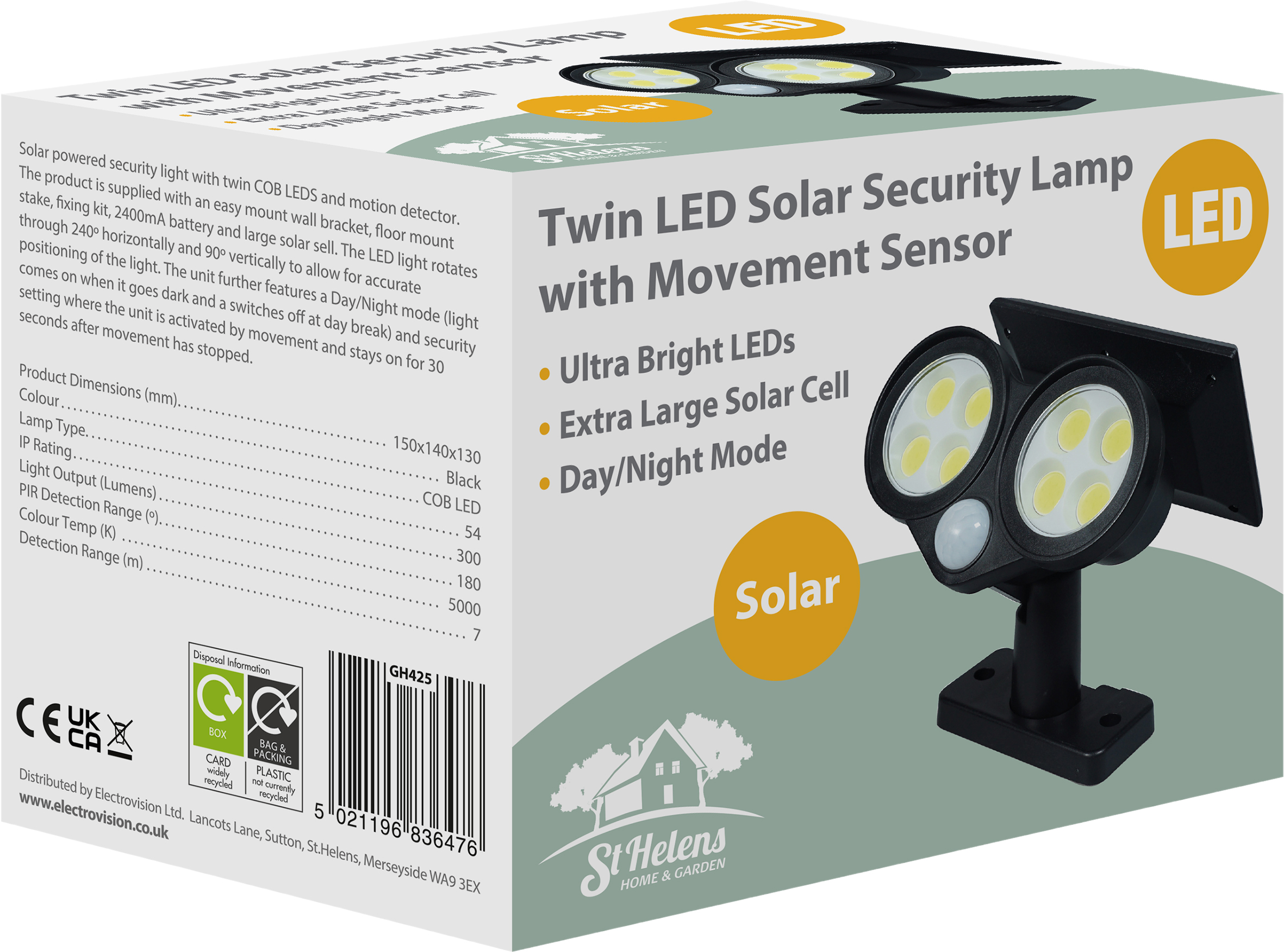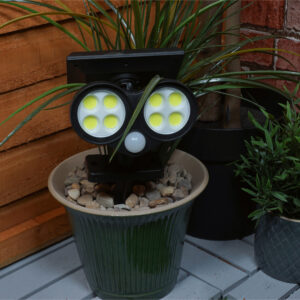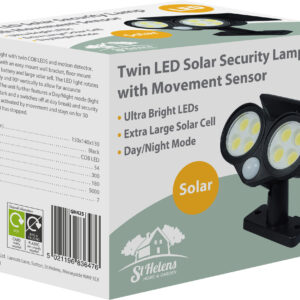 Solar powered security light with twin COB LEDS and motion detector. The product is supplied with an easy mount wall bracket, floor mount stake, fixing kit, 2400mA battery and large solar sell. The LED light rotates through 240 degs horizontally and 90 deg vertically to allow for accurate positioning of the light. The unit further features a Day/Night mode (light comes on when it goes dark and a switches off at day break) and security setting where the unit is activated by movement and stays on for 30 seconds after movement has stopped.