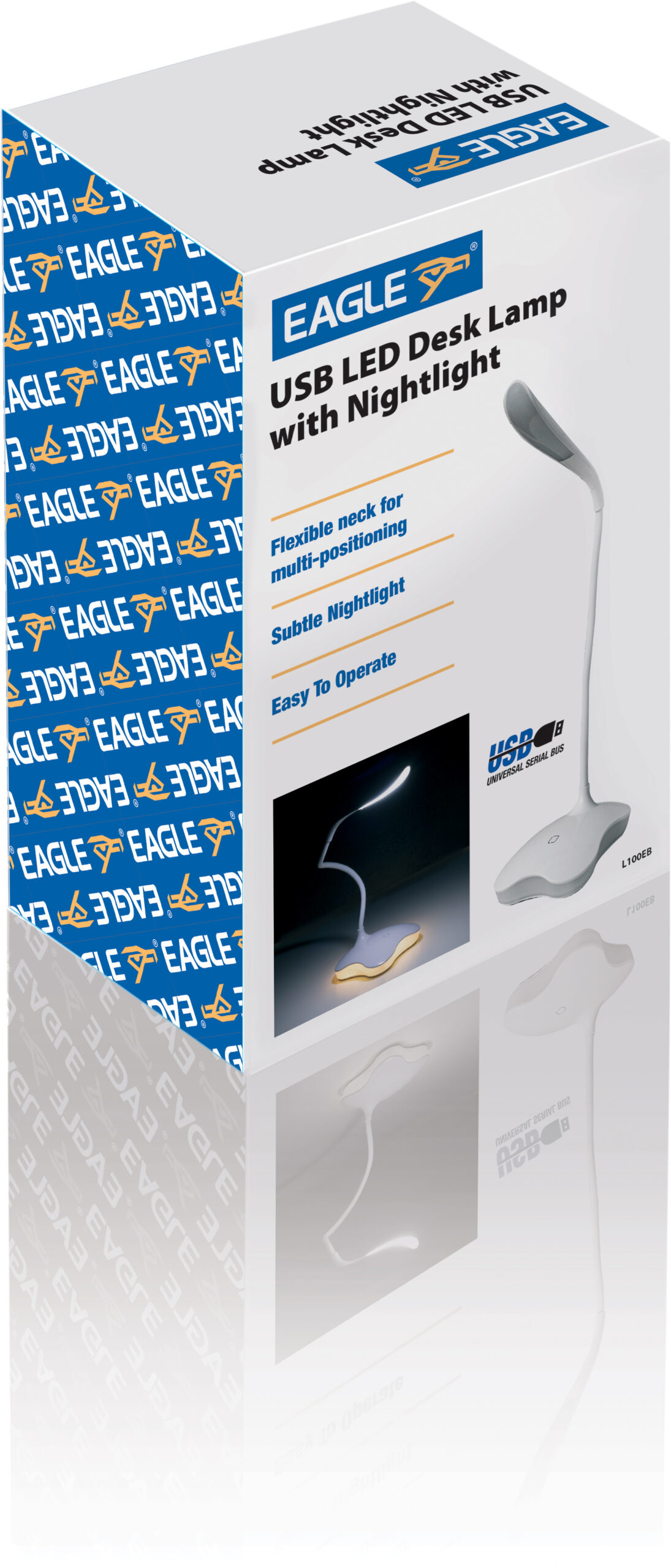 The Eagle USB LED Desk Lamp features a subtle nightlight, the lamp can be powered by battery (4xAAA not included) or USB. The long flexible neck allows multi-positioning to suit each user. Operated with a One Touch function which allows for easy control of the 3 brightness settings.