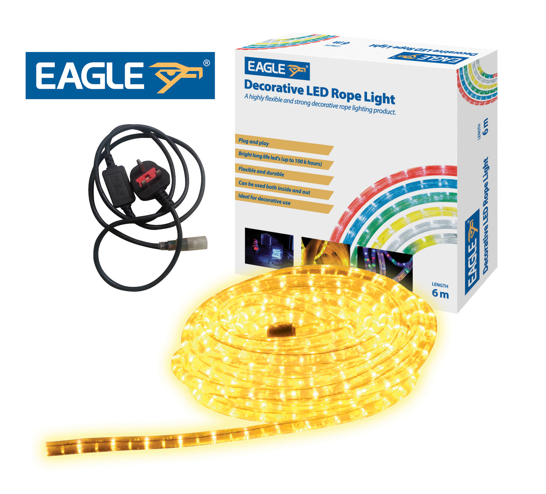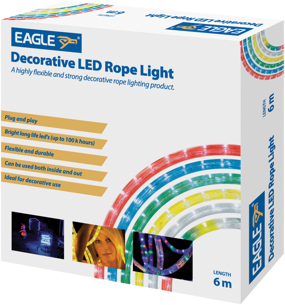 A highly flexible and robust decorative rope lighting product supplied with a fitted 1.85m mains lead. The product features ultra bright LEDs producing intense vibrant colours, highly flexible tube allowing complex designs and shapes to be produced and is easy to install using clips and channelling (not supplied). The product is ideal for many decorative uses such as restaurants, shops, homes and for general festive use. The rope light has a wide operational temperature range from -20C to + 60C and can be installed inside and out (when installed correctly).
