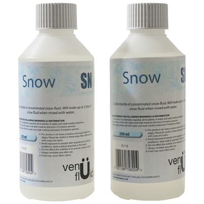 A 250ml bottle of concentrated snow fluid. Will make up to 5 litres of snow fluid when mixed with water.