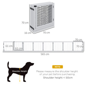• Dimensions: 70H x 565L x 44Wcm. Single panel: 70H x 70Wcm. Wire spacing: 4.5H x 15Lcm. Assembly required. Suitable for small and medium dogs, less than 50cm in shoulder height.