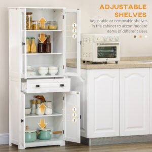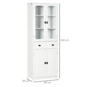 Running out of kitchen space? This HOMCOM is an excellent solution to your storage woes. A tall, narrow design is great for smaller spaces. Comes with a top and bottom cupboard, with a middle drawer; five adjustable shelves to fit into differently-sized pieces. Made from particle board for a durable structure, with anti-tipping straps included for safety. A white design, with black handles for a stylish monochrome look.