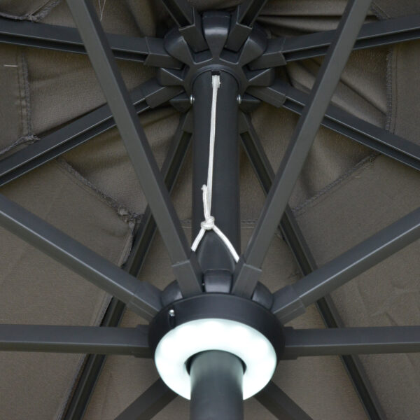 Keep yourself protected whilst enjoying the sun all day long with this sun umbrella from Outsunny. The polyester canopy provides protection from direct sunlight and heat. Using a crank mechanism for effortless opening and closing, the umbrella pole can be easily tilted to maximize your shade. Powered by panel solar, the LED lights on the ribs can provide you more lights at night. The perfect blend of beauty and function.