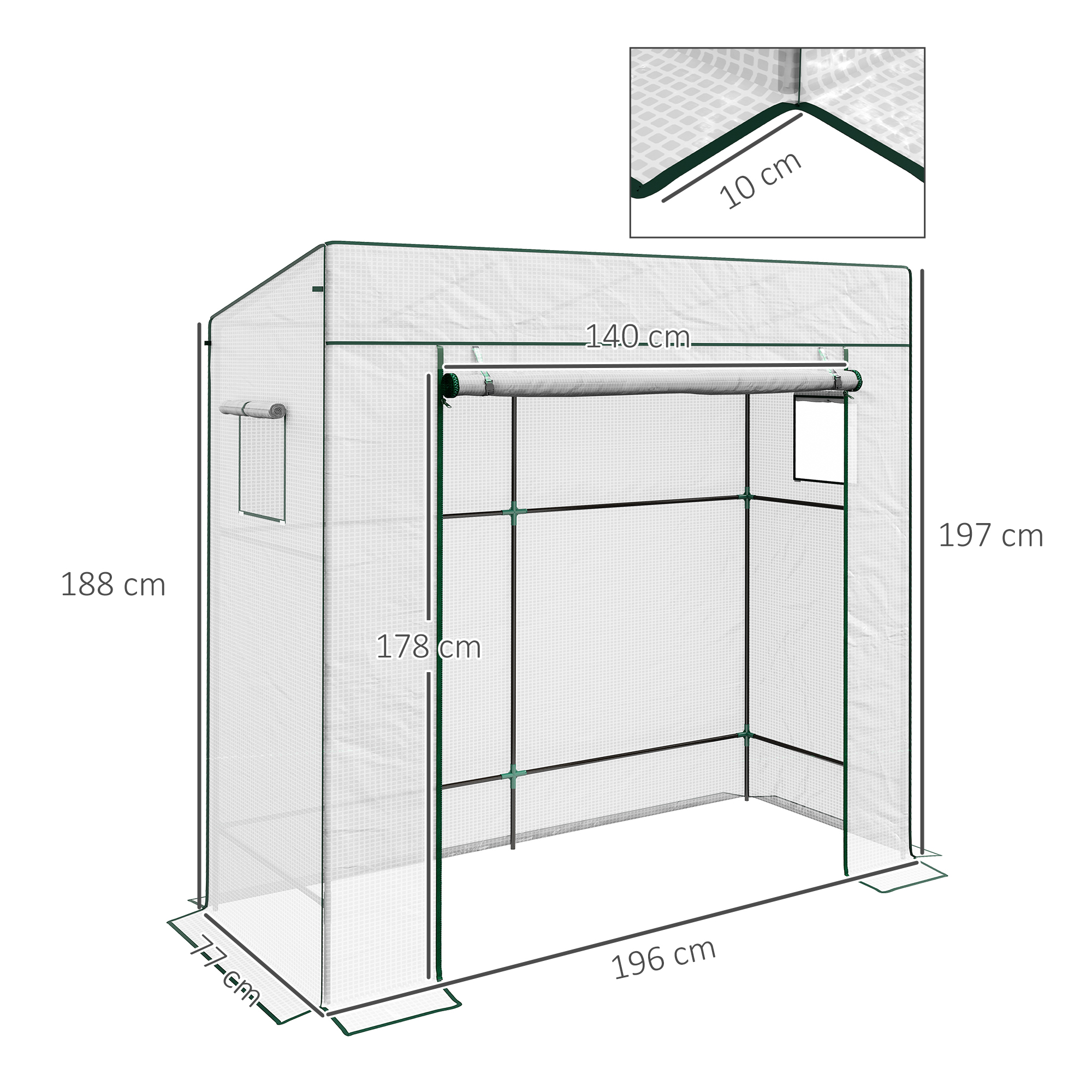 No more worrying about your carefully kept plants and flowers freezing! Outsunny walk-in greenhouse is a spacious and convenient solution for gardeners of all levels. Enough vertical space is designed for climbing plants like cucumbers and tomatoes to grow. PE cover with roll-up door and mesh windows creates a desirable temperature and humidity for plants to grow. Embrace the art of horticulture with the Outsunny small greenhouse.