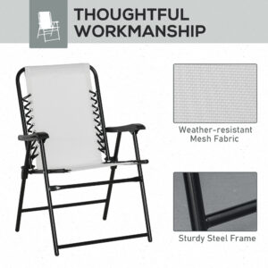 This four-piece outdoor folding chair set from Outsunny is great for any gathering, both indoor and outdoor. The garden chair frames are made from powder coated steel for a strong, supportive structure. Mesh fabric seat holds your body comfortably, the high back and armrests give you support. Lightweight and foldable, each chair is easy to carry and store. Spend no time assembling; sit back and relax!