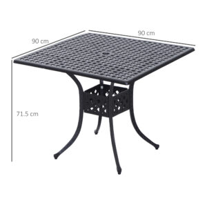 Outsunny’s square garden table is a great solution for seating up to four people for a sit-down meal outside. Water-safe cast aluminium frame is for durability and longevity. It has metal-work grid motifs and a convenient centre umbrella hole to add shade with a matching umbrella. The grid top design helps drain away rainwater, while its versatile style can be paired with various seating options. Embrace the outdoors, relax in comfort and choose Outsunny for your outdoor dining needs.