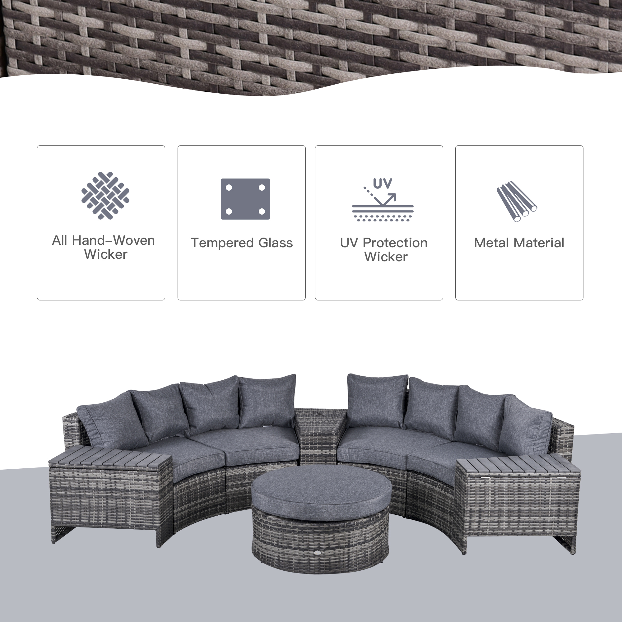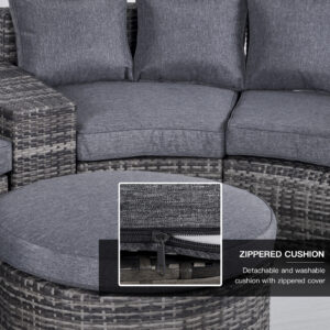 Bring everybody outdoors together this season with this semi-circle dining set from Outsunny. Comes with four armless chairs, three small tables, and a round ottoman – perfect for when guests come to visit. Each piece uses aluminum for the mainframe, wrapped in PE wicker for a garden-ready look that is durable and resistant to mild weather damage. Side tables come with handy storage, the middle table features an umbrella hole in the middle of the table for a parasol, keeping you comfortable and protected when the sun is shining.