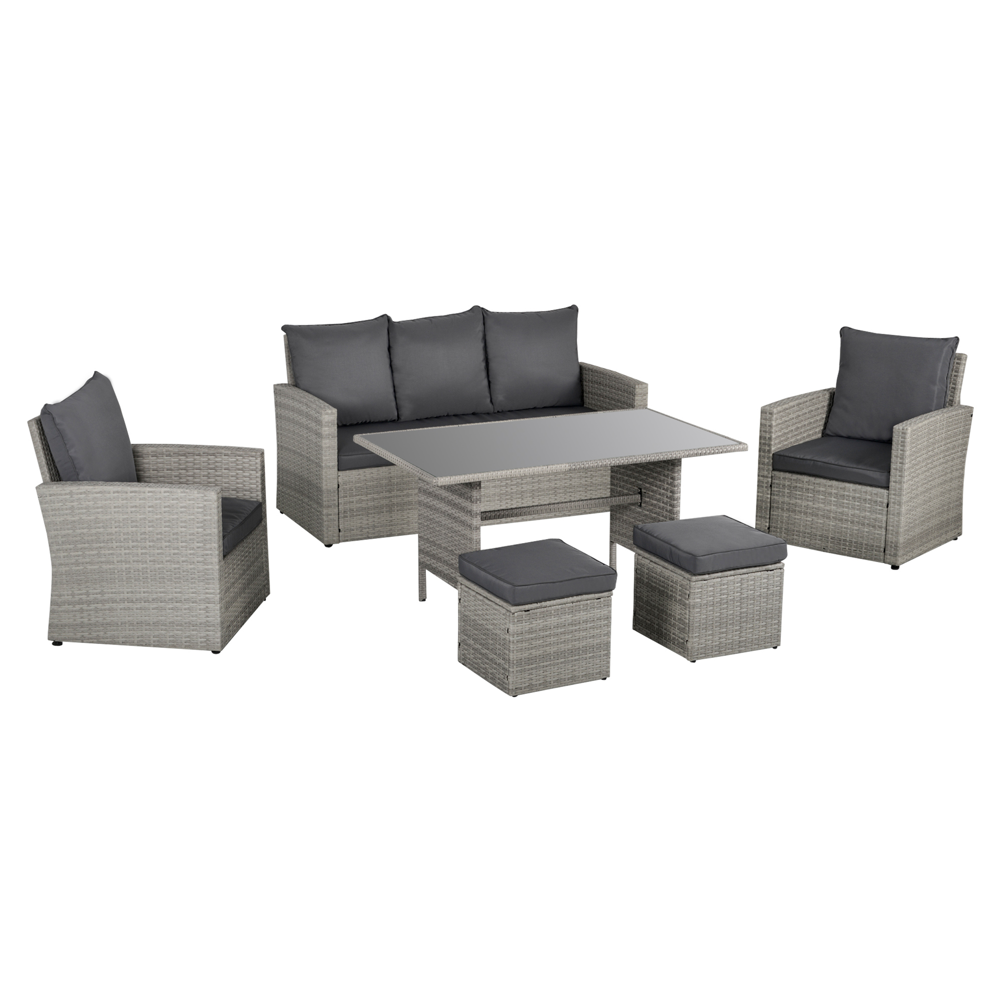 - Set comes with two armchairs, two footstools, a three-seater sofa and tempered glass dining table