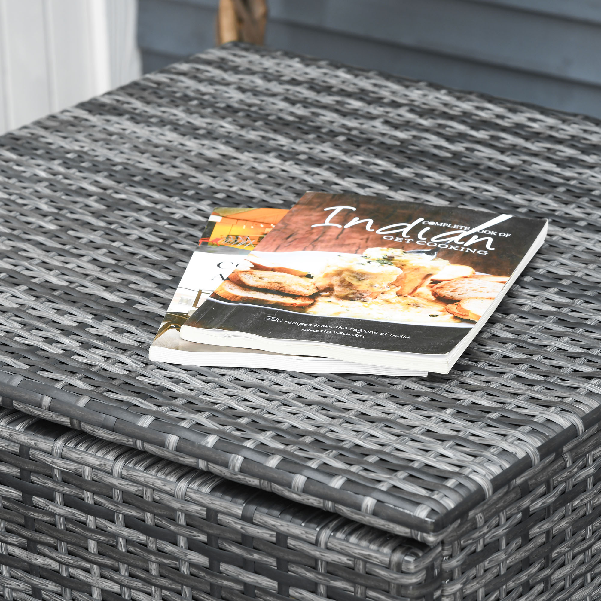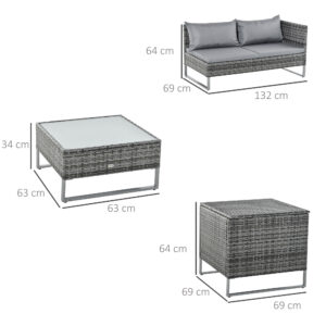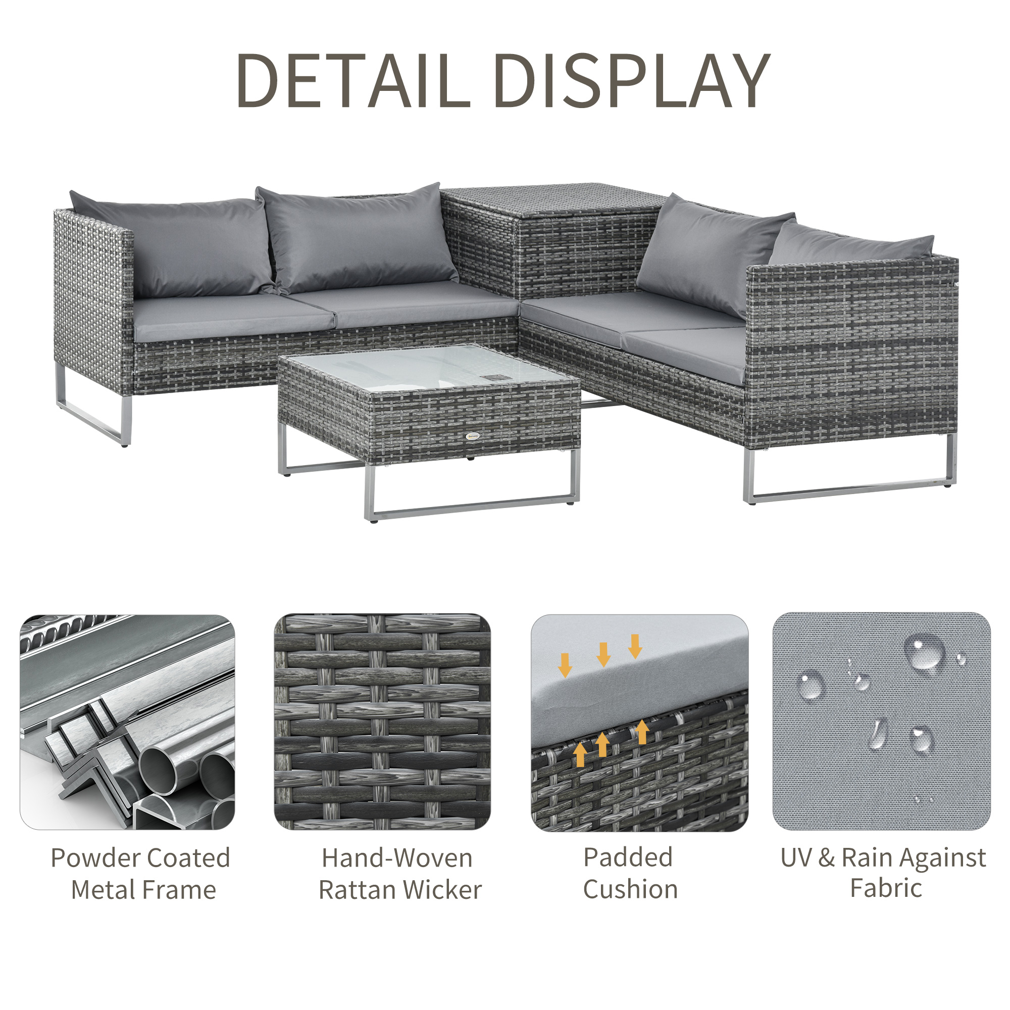 Let this rattan set from Outsunny take the lead for your outdoor comfort this season. It consists of four pieces ?? two two-seater sofas with one small end wall on each, a storage trunk and a small coffee table. Each piece is made using a powder coated metal frame for strength, with PC wicker wrapped on top for weather-resistance, with thick grey cushions on the seats and backs for all-day comfort. Tall in height, the corner trunk provides lots of storage room to keep your garden tidy.