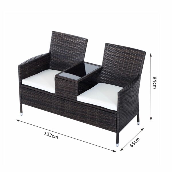 Make those wonderful times outdoors even better than before with this double seat rattan chair from Outsunny. Using metal for the base frame to provide underlying strength for seasons to come, it is crafted into an all-in-one two seat and middle table design ?? giving space for you to sit with a friend with a place to keep drinks, books and smaller items right next to you. Dark grey in colour, PE wicker rattan is wrapped around the metal, giving this duo seat style and protection against mild weather damage to make it a long lasting addition in your garden. Fire-retardant for safety, thick cushions are placed on the seats for comfort, with water-resistant covers which can be cleaned for hygiene, with thick tempered glass on the table for a smooth and sleek surface which is easy to keep clean.