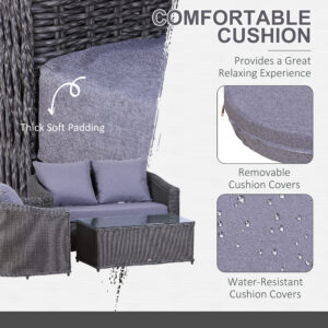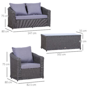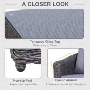 Try out this chic garden sofa set from Outsunny. Tough, stable and durable for regular use outdoors. Thick fitted seat cushions are placed on all the seats so you??ll be sitting comfortably, With a thick tempered glass top on the table for a sleek look which can be cleaned in an instant, this conservatory furniture is finished with foot pads to keep everything level and protect your floor at the same time. A great addition for any patio, conservatory and garden.