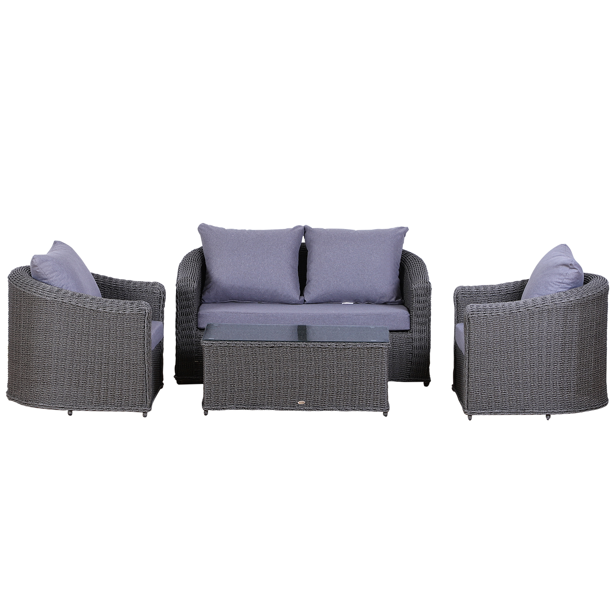 Try out this chic garden sofa set from Outsunny. Tough, stable and durable for regular use outdoors. Thick fitted seat cushions are placed on all the seats so you??ll be sitting comfortably, With a thick tempered glass top on the table for a sleek look which can be cleaned in an instant, this conservatory furniture is finished with foot pads to keep everything level and protect your floor at the same time. A great addition for any patio, conservatory and garden.