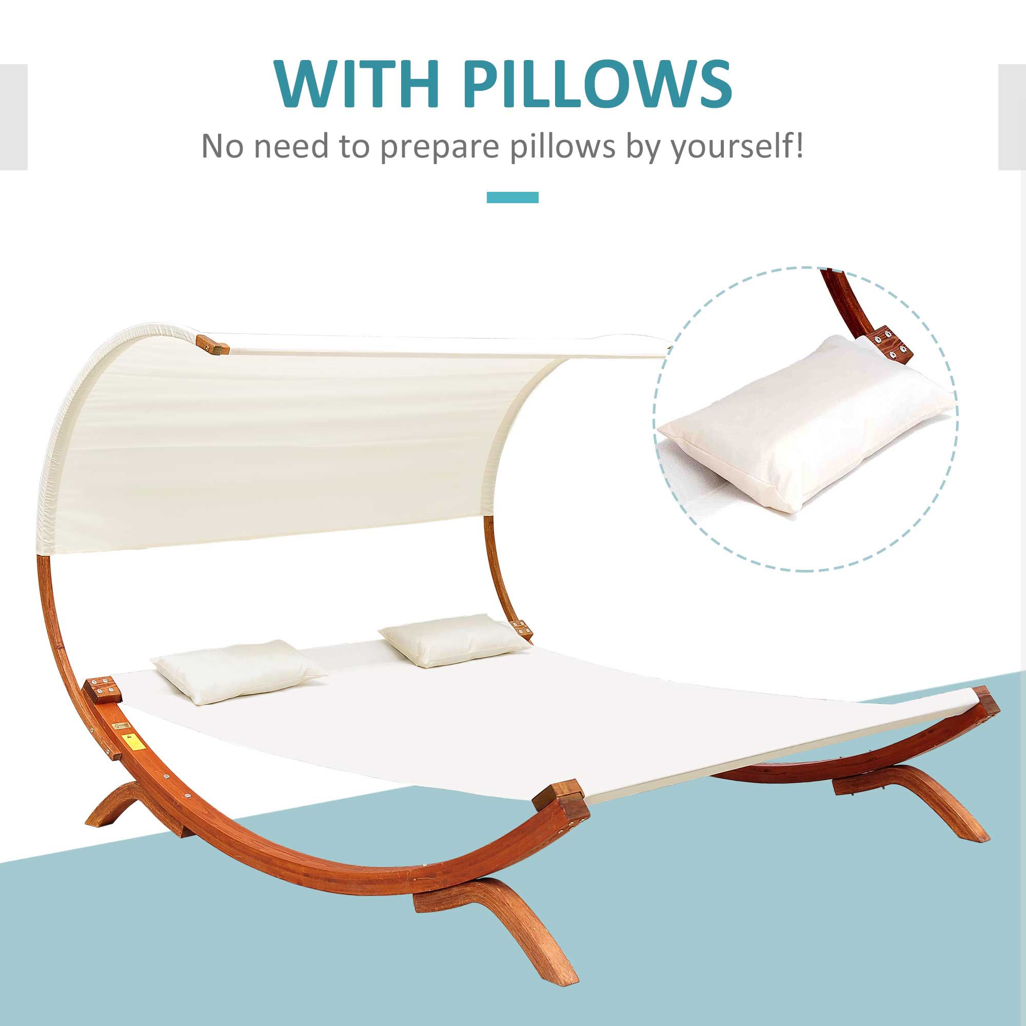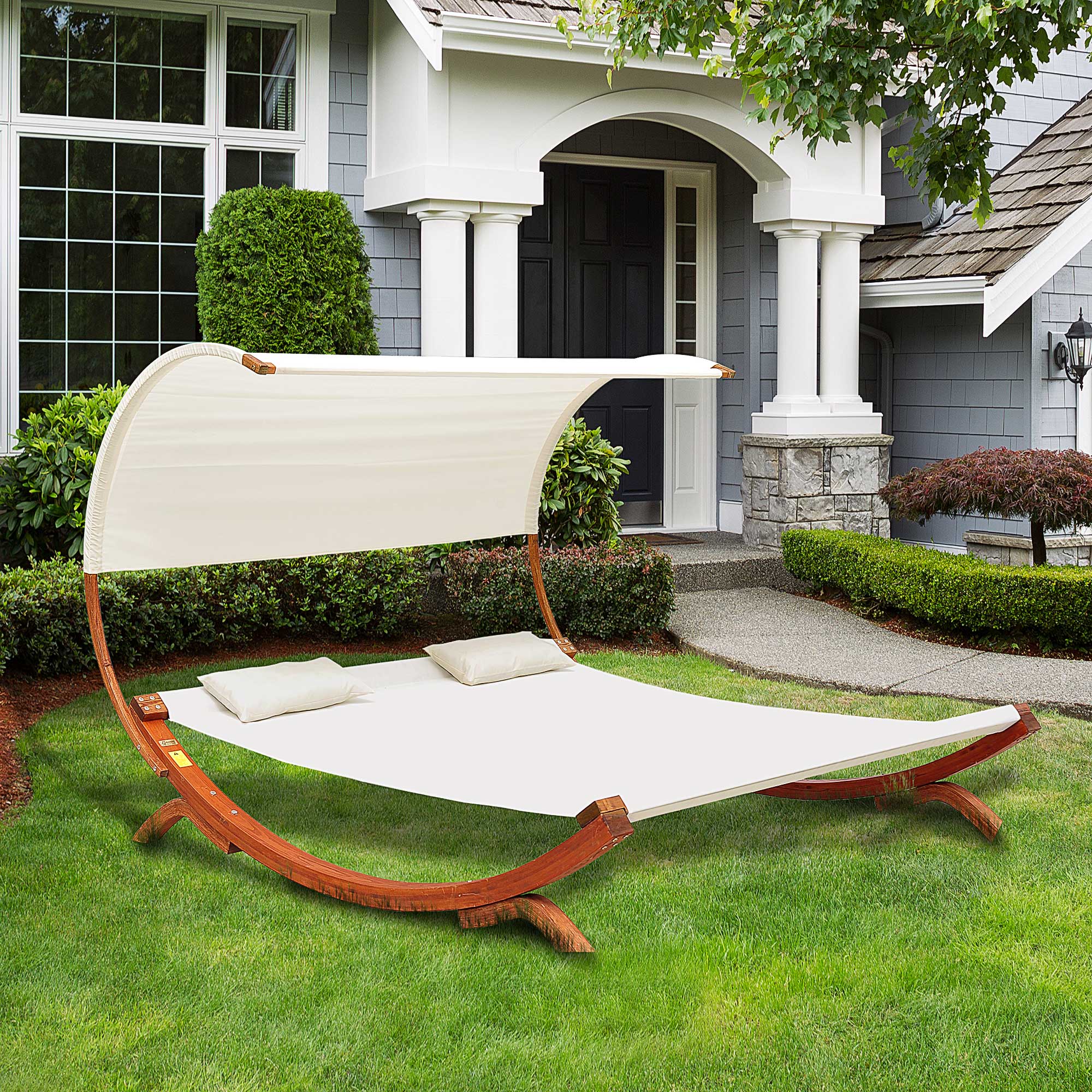 The wooden double hammock bed is perfect for two people. The sturdy high quality Russian larch wood frame is sure to make you feel comfortable and stable while you lay quietly in the sun. A padded headrest is included for added comfort. The durable, quick-drying fabric is woven for durability. The waterproof canopy lets you stay cool and enjoy the wonderful summer weather.