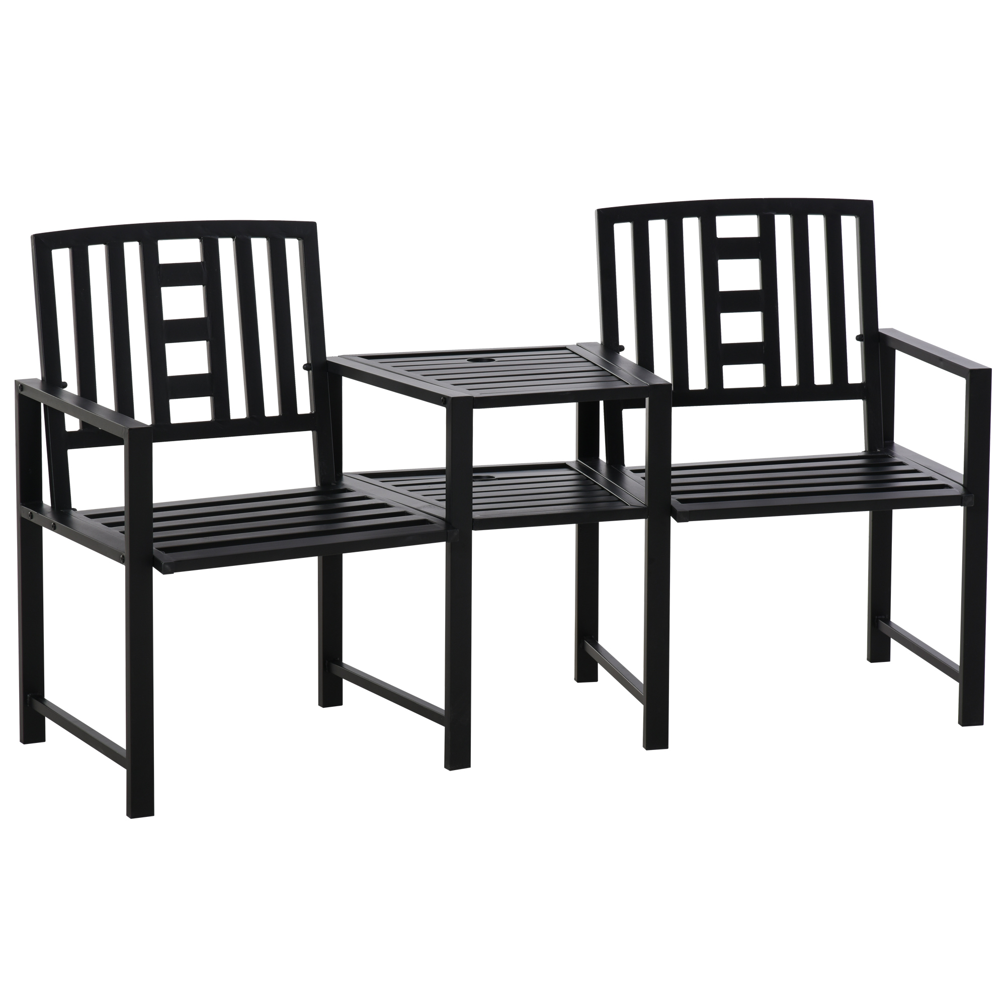 Ensure all your hours spent relaxing in the sun and outdoors are as enjoyable as possible with this love seat from Outsunny. Made from metal for a tough and durable structure, it is crafted into two single-seat design with a middle table ?? providing room for you and a friend to sit and enjoy the fresh air. Slatted all over to prevent water build up and allow air to pass through, it is finished with a middle hole in the table to steadily hold a parasol.