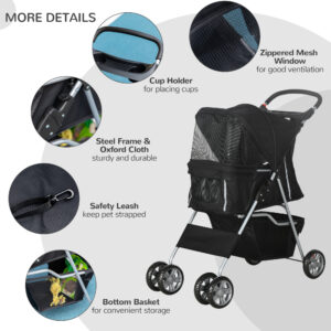 - Bottom storage compartment and cup holder for easy access to pet supplies and personal belongings