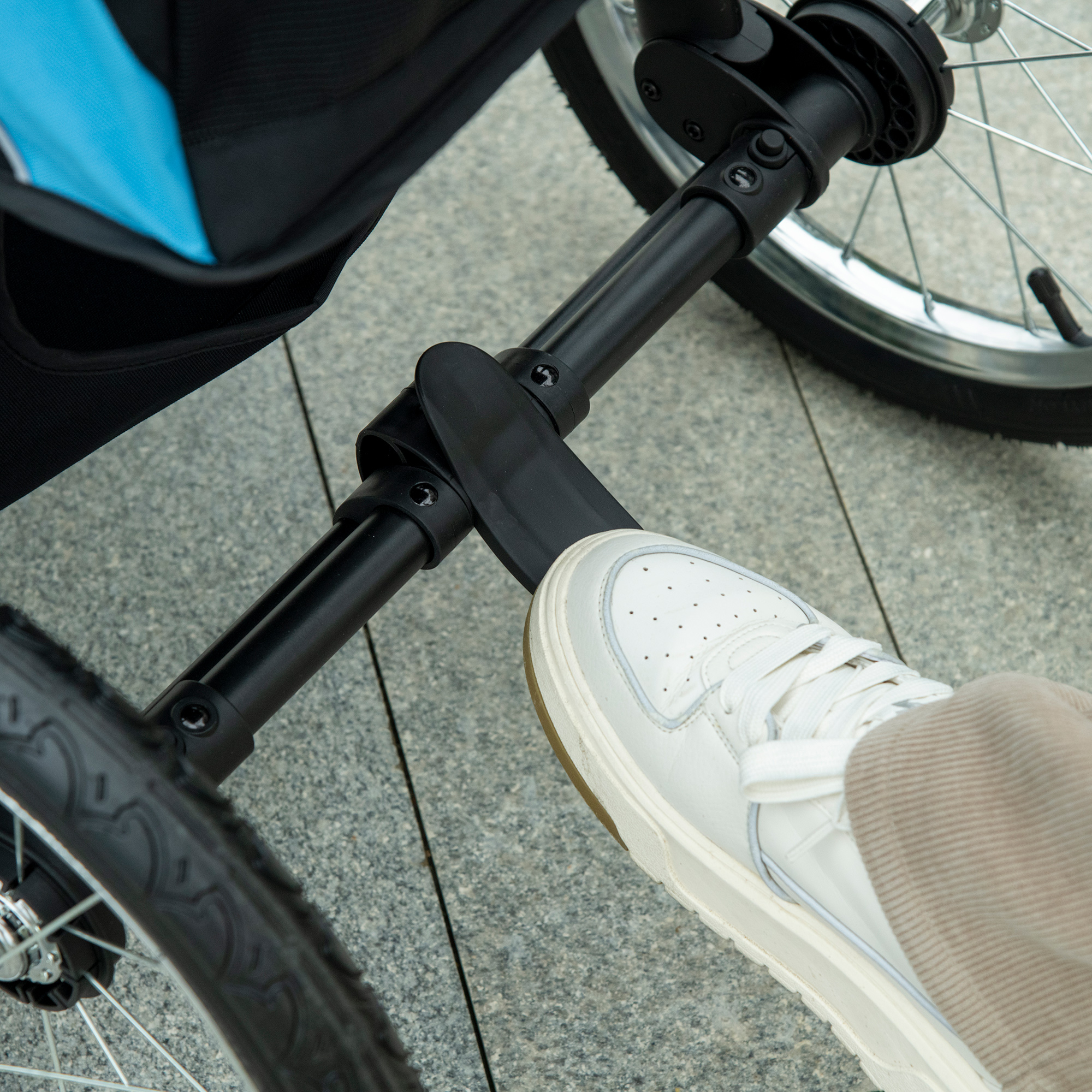 - Safety leashes, reflective strips and a rear footbrake provide safety and security