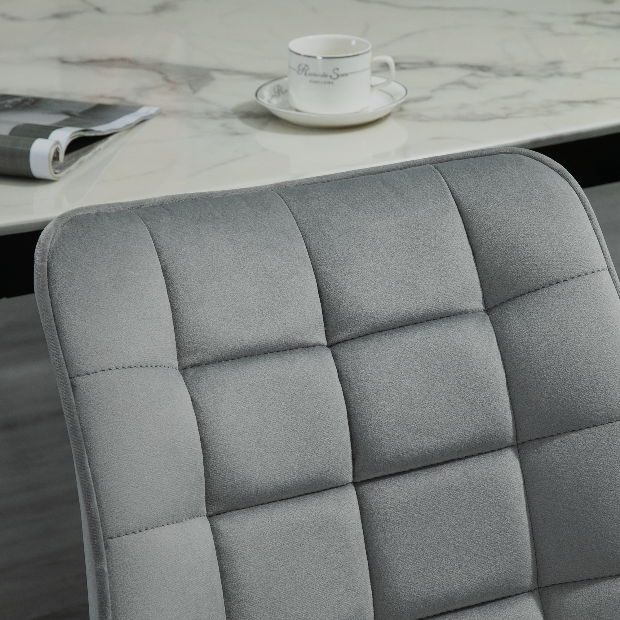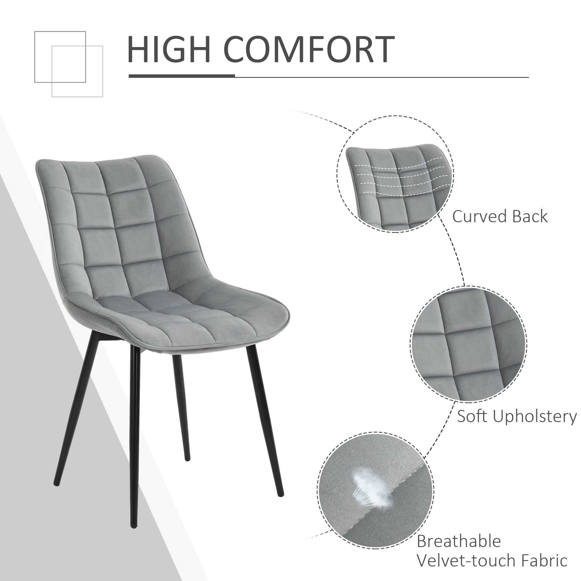 Let these two HOMCOM dining chairs do all the stylish talking for your home and beyond. Each large seat is formed into an open design, where it curves gently and softly for you to sit with ease. Padded with sponge for comfort, the seats are wrapped in velvet-feel upholstery which is soft on the skin. Made from steel, the base frame of each chair is sturdy and will ensure you are seated steadily. Finally, a piece which strikes the right balance between style and comfort.