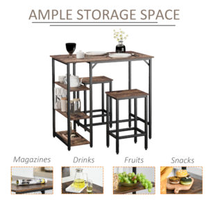 Introduce style into your dining times with this three piece set from HOMCOM. Focusing on an industrial design, the dark brown and black colourway is versatile so it works in plenty of differently-styled living spaces. The table comes with three side shelves to give you convenient and discreet storage. Using steel for the frames, each piece is sturdy so the set can be used everyday without hesitation. Finished with adjustable feet to keep the balance at all times. The only place to gather round mornings and evenings this season.