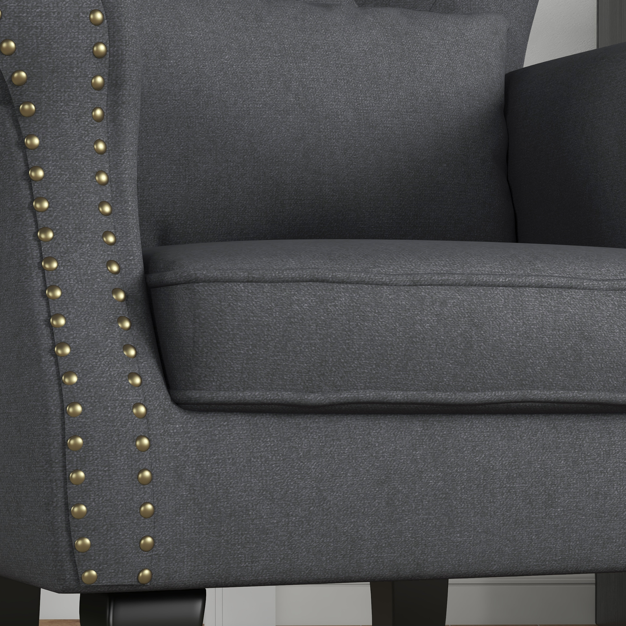 - Chesterfield-style wingback chair: Button tufting and rolled arms with metal studding