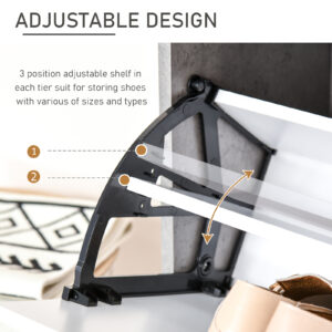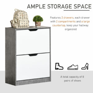 Start organising and storing your footwear the easy way – go for this shoe cabinet from HOMCOM. Made from particle board, the structure is solid and durable and crafted into a two-drawer design which offers space for up to eight pairs of shoes. Each drawer features a three-level adjustable shelf for more personalised storage. Straps on the back ensure anti-tipping safety, meaning this cabinet is suitable for homes with children and pets. It’s finished with a flat top, offering even more space for you.