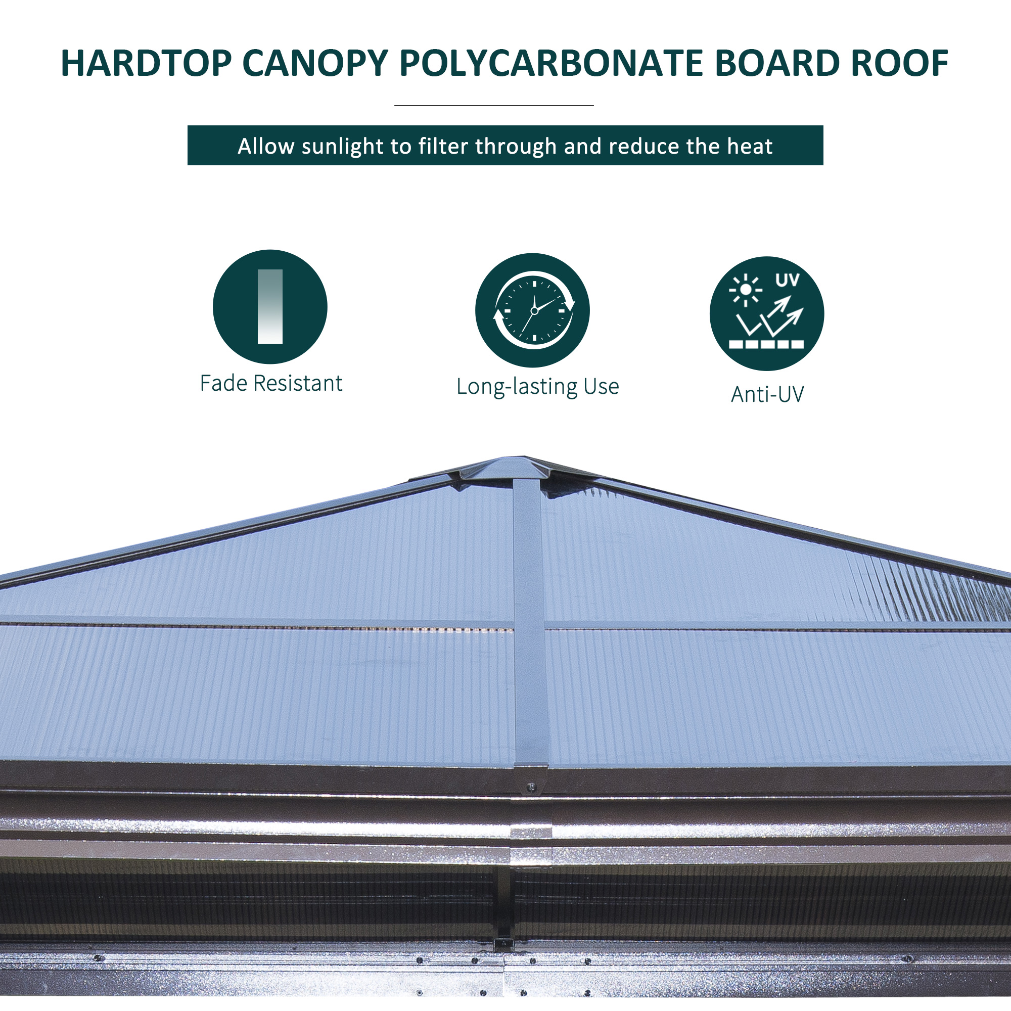 - Polycarbonate hardtop protects from UV rays and light weather