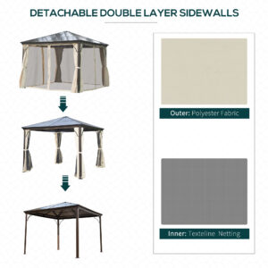 Add an elegant touch to any outdoor space with this Outsunny 3m x 3m gazebo with netting, a perfect sun shelter for any occasion! The polycarbonate roof is UV protection. Rust resistant aluminium for the frame makes it sturdy, formed into a spacious size – you can host plenty of people at once. Curtains create privacy, each with inner netting to shield you from annoying bugs and more. Life is meant to be enjoyed outdoors, so enjoy this hard roof gazebo in your own backyard space.