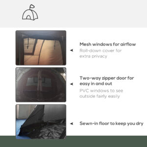 This Outsunny dome tent provides plenty of sleeping and socialising room for outdoor adventures. Using fibreglass poles that stays in shape, it’s fitted with a 2000mm water-resistant polyester canopy for proper shelter. PVC windows for outside/inside views and mesh windows for ventilation, which have covers for extra privacy. The inner space of this 4 person tent is divided into two rooms, with double doors for easy access.