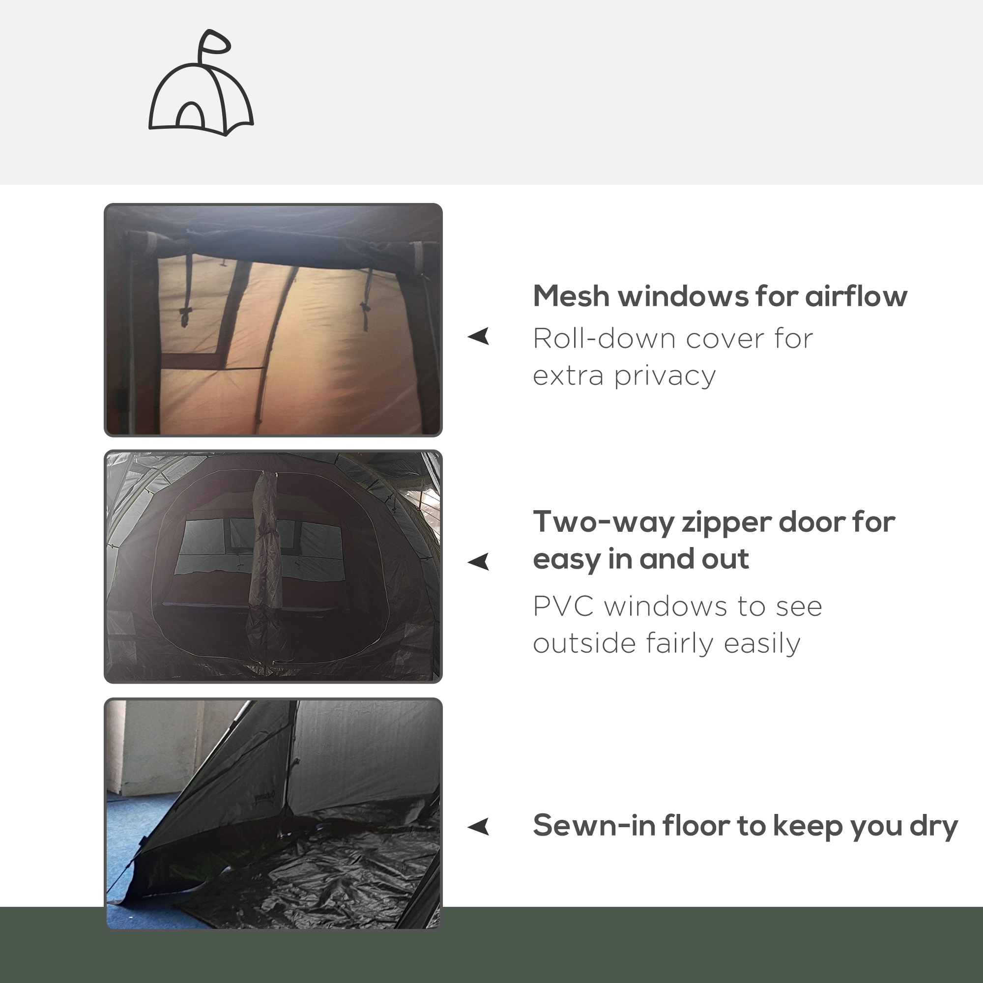 - Plastic windows for outside/inside views and mesh windows for ventilation, which come with covers for extra privacy