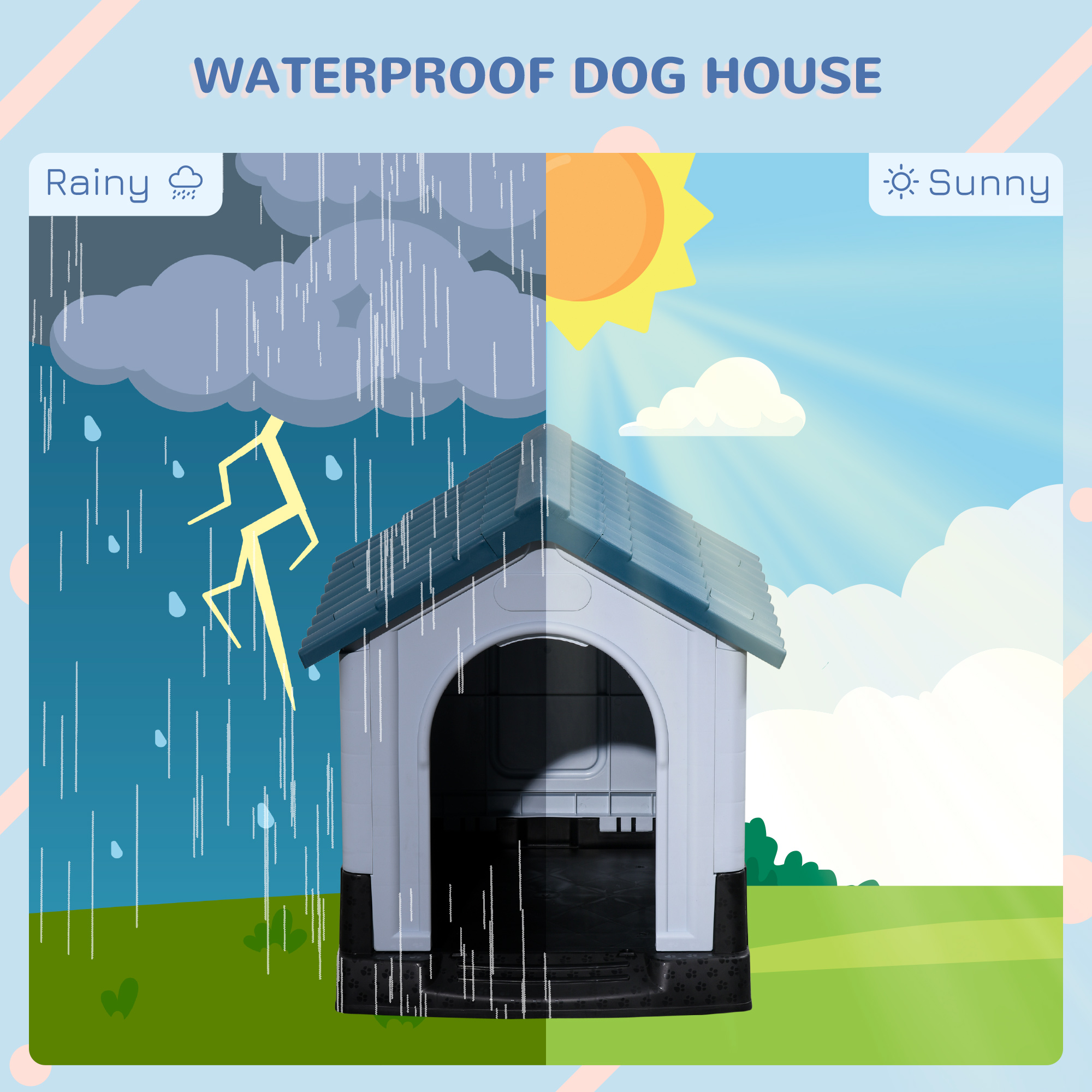Treat your pet to the ultimate relaxing spot with this PawHut plastic dog kennel. Suitable for outdoors, its slanted roof shelters them from rainwater ?? it also provides a cool shade during the hotter months. It is 6.5cm off the ground, stopping dampness and moisture from seeping through, so they stay dry, warm and cosy. Three windows and a large door for air to flow through, keeping their space fresh and ventilated. Quick and easy to set up, pets will have an outdoor haven to love and enjoy.