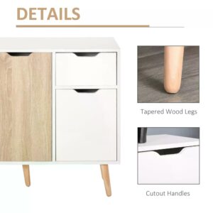 Keep your home stylish and the space tidy: look no further than this freestanding cabinet from HOMCOM. Cut to a clean boxy shape for simplicity, it comes with two large cupboards, a smaller cupboard and a top drawer, giving an abundance of handy storage. The white frame is clean, with the mix of white doors and coloured doors adding a unique point of difference so it stands out. Made from particle board, this piece is durable, finished with five wooden legs so it stands steady and back straps so it doesn’t topple over.