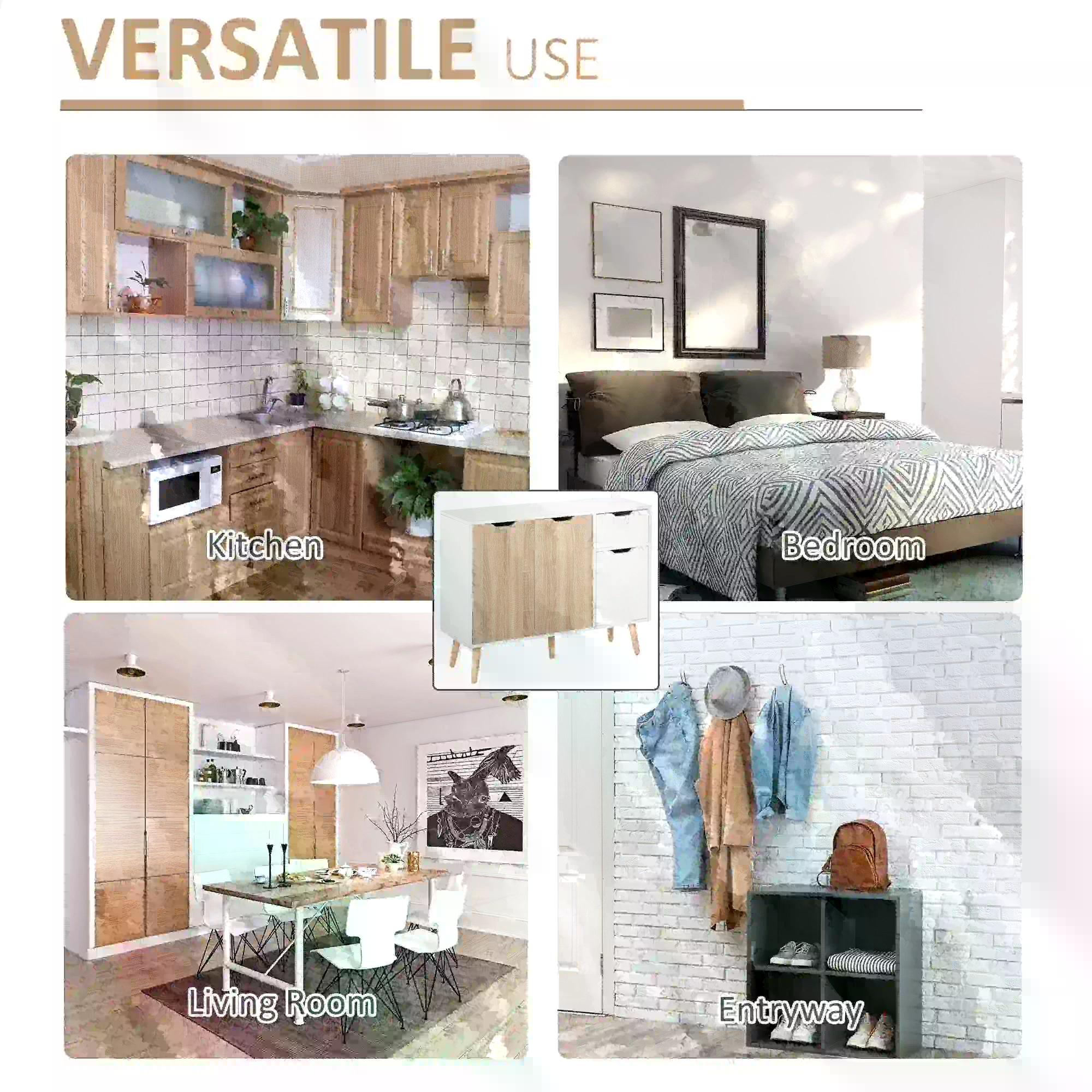 Keep your home stylish and the space tidy: look no further than this freestanding cabinet from HOMCOM. Cut to a clean boxy shape for simplicity, it comes with two large cupboards, a smaller cupboard and a top drawer, giving an abundance of handy storage. The white frame is clean, with the mix of white doors and coloured doors adding a unique point of difference so it stands out. Made from particle board, this piece is durable, finished with five wooden legs so it stands steady and back straps so it doesn’t topple over.