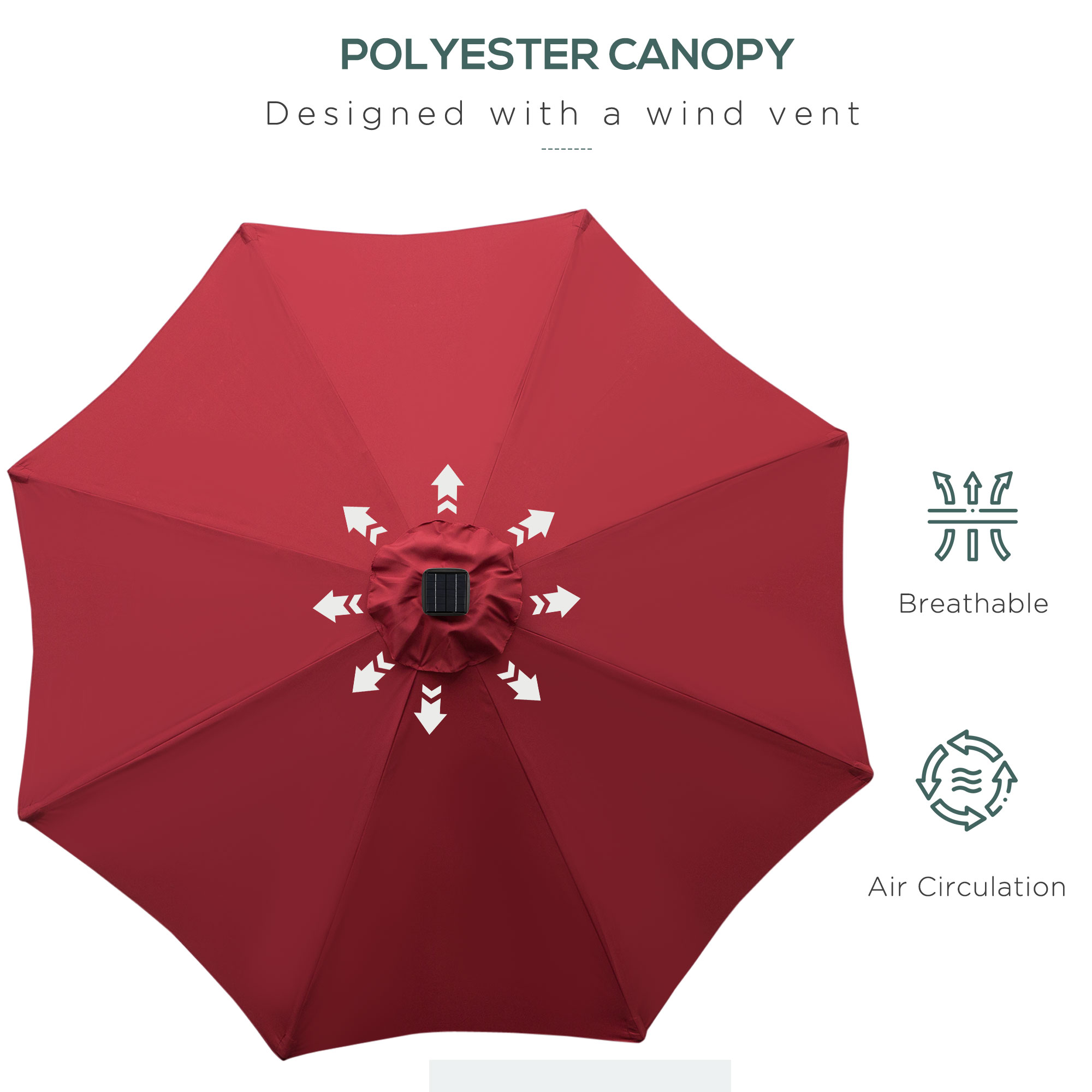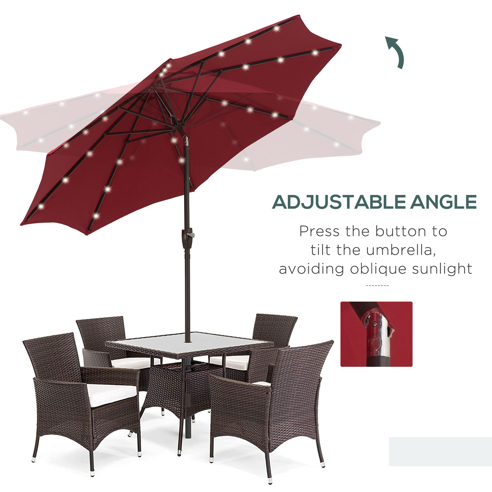 This Outsunny parasol umbrella with lights is a perfect choice to give shade on those sunny days, the deck parasol has the ability to tilt for better protection. It is suitable for your patio, garden, and can be used with existing garden furniture. The steel structure and polyester fabric give support and long-lasting features. The garden umbrella parasol is with solar-powered Led lights with adjustable 4 colours. So when it gets dark you can still continue enjoying the outdoors.