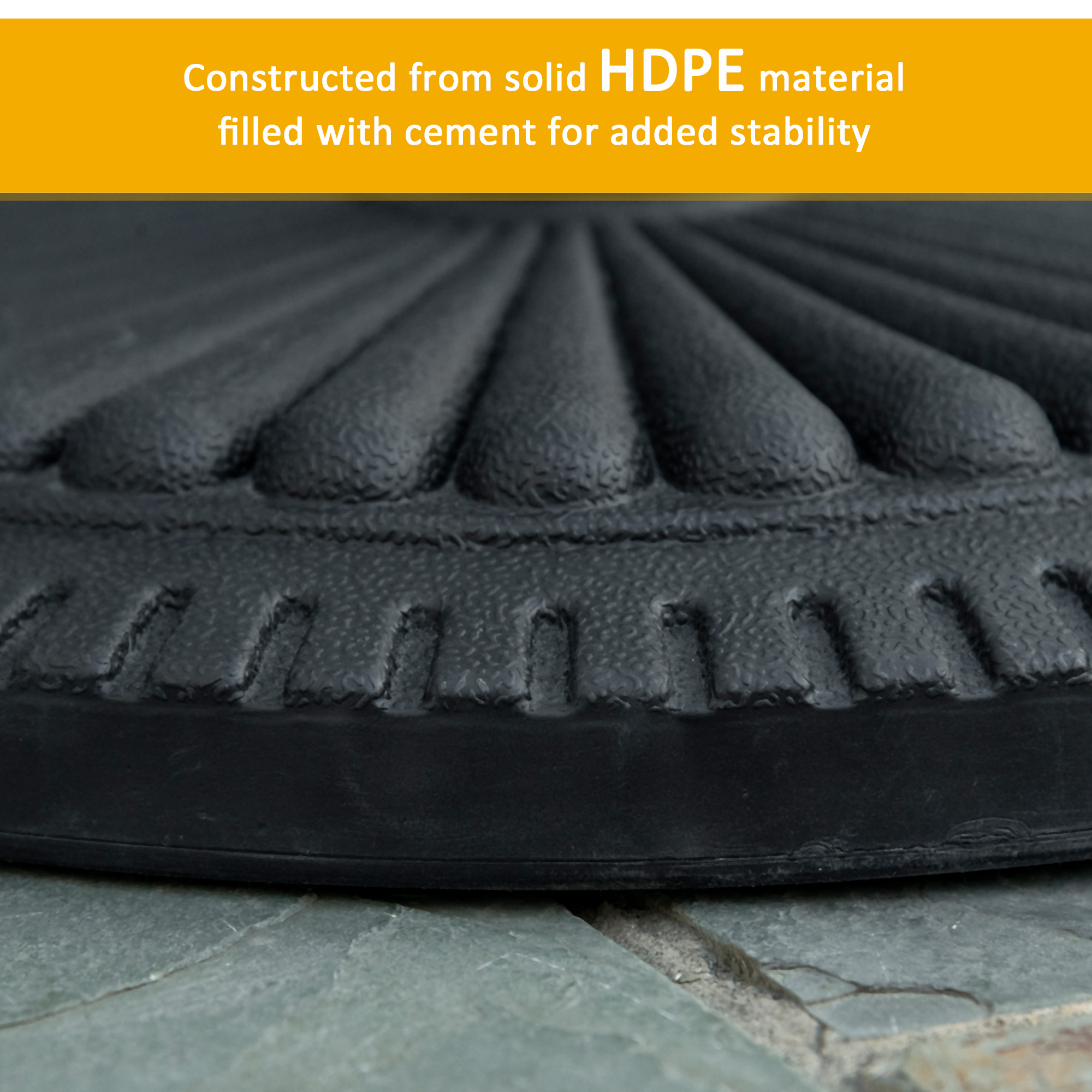 - Tough plastic casing filled with cement, weighing 14kg to keep your sun parasol in place all day long