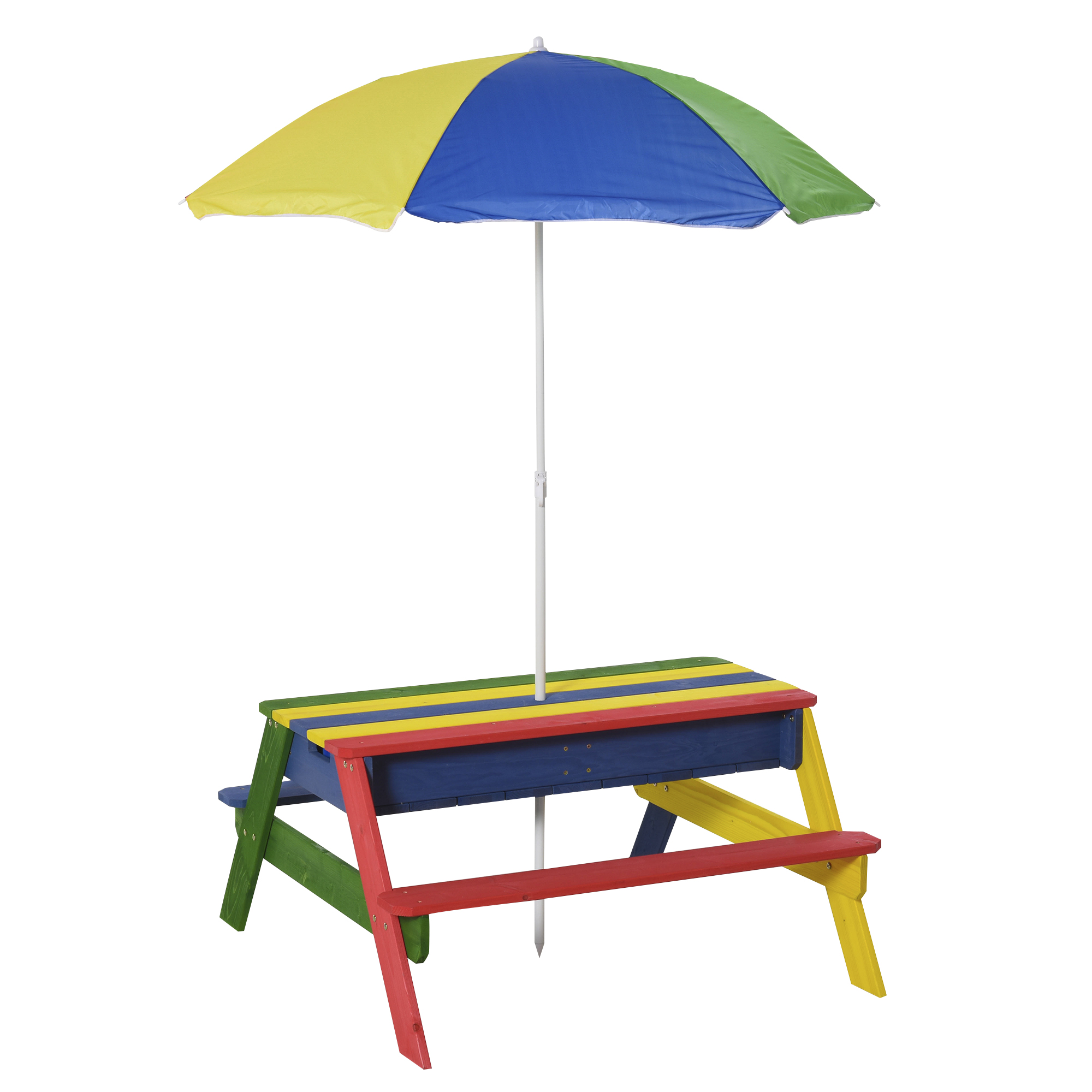 The Outsunny kids outdoor picnic table set with umbrella is specially designed for kids, gives them their very own outdoor seating area to eat meals, play sand, play games, and more. A matching umbrella is included to provide shade during the summer and on otherwise sunny days. With its beautiful and colorful pattern design, it makes a great addition to any backyard setting. Thanks to Outsunny, your kids will love having furniture that’ made especially with them in mind!