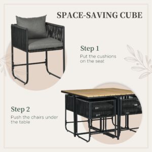 Outsunny Patio 5 PCs PE Rattan Dining Set, Garden Round Wicker 4seater Rattan Cube Dining Sets, w/ Wood Grain Plastic Top, Spacesaving Design