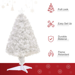 Wonderfully white, this HOMCOM artificial tree is a pure and beautiful way to enjoy Christmas this season. 2.5ft size is tiny – great for having on office desks, home entrances and smaller spots. Features built-in fibre optic lights: an array of colours which flash and twinkle in different patterns. 85 branch tips for a voluptuous look, finished with a star topper and base, so it stands balanced.