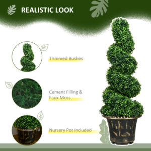 Green plastic plants, all year round with these two Outsunny spiral boxwood trees. The faux plants will stay green for many years; no trimming or shaping required. Each plant has 1300 leaves – realistic colour and texture for a realistic look. They come with cement-filled pots to keep weighted.