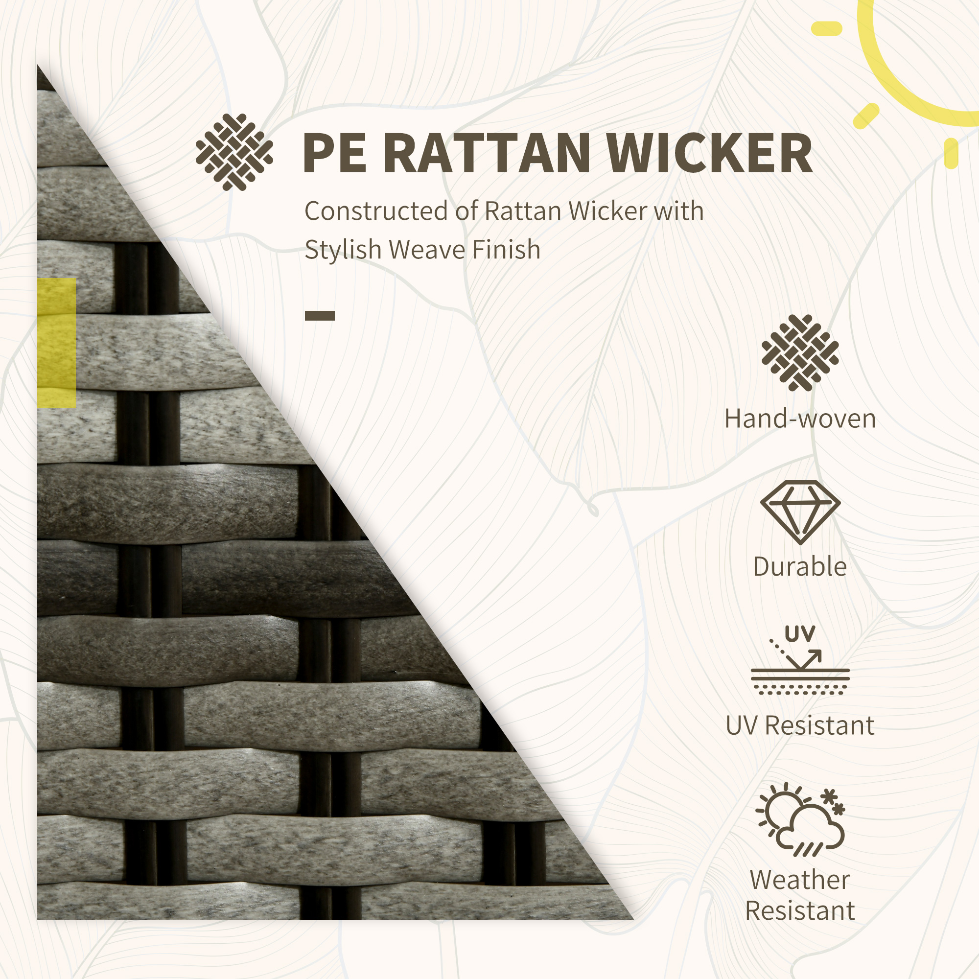 Do those lazy afternoons in the sun the right way ?? choose this outdoor seating set from Outsunny. Formed of three pieces ?? two armchairs and matching table; enjoy outdoors with company. Powder coated aluminium frame for a strong structure, wrapped in stylish plastic rattan – double the durability. Both chairs come with seat and back cushions for comfort.